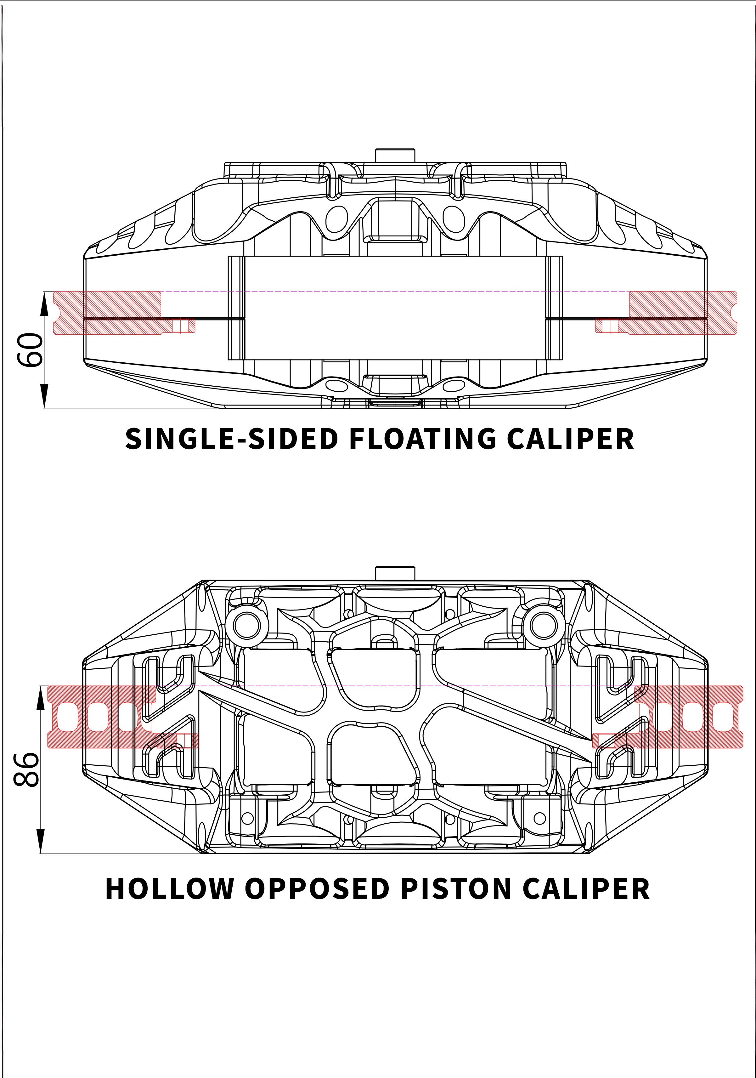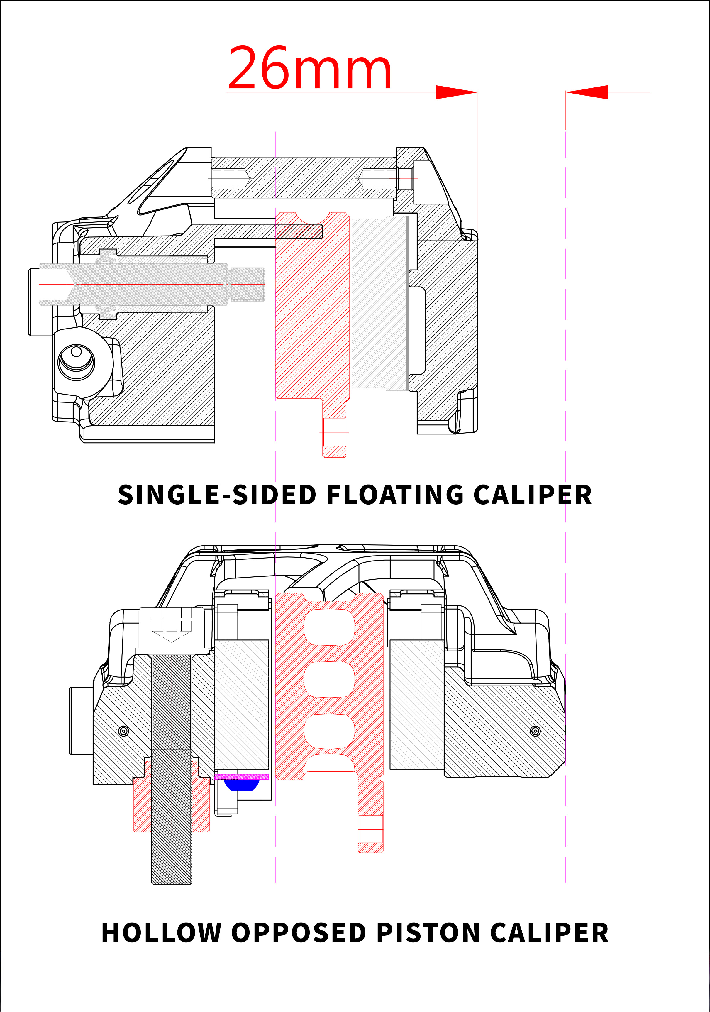 To address this challenge, we developed a world-patented Single-Sided Piston Caliper Upgrade System, using the mounting thickness of the OEM single-piston caliper as the baseline reference. Without compromising braking performance, this system requires 26mm less clearance within the inner rims compared to typical Hollow multi-piston calipers, significantly improving compatibility with factory small-size wheels.