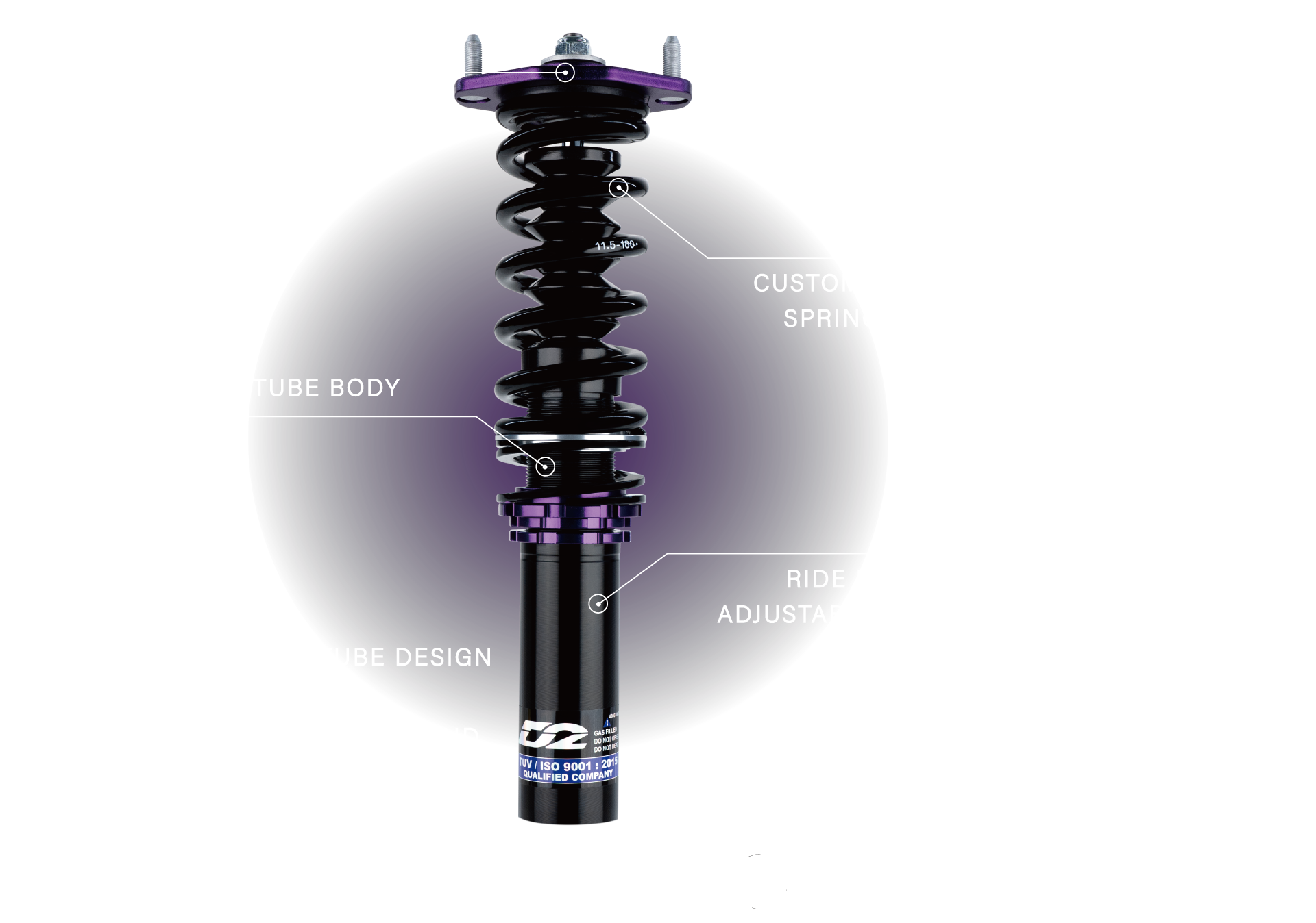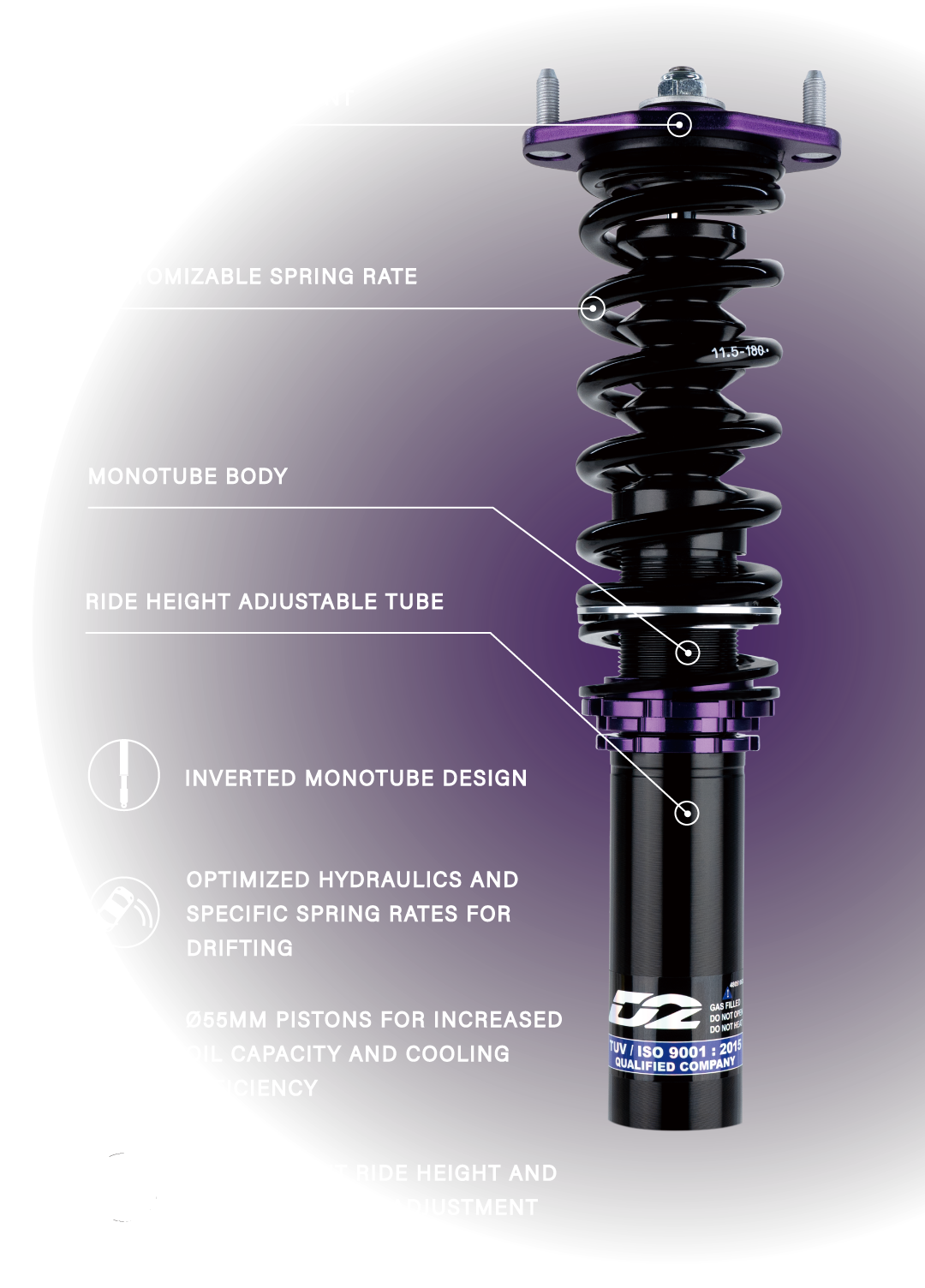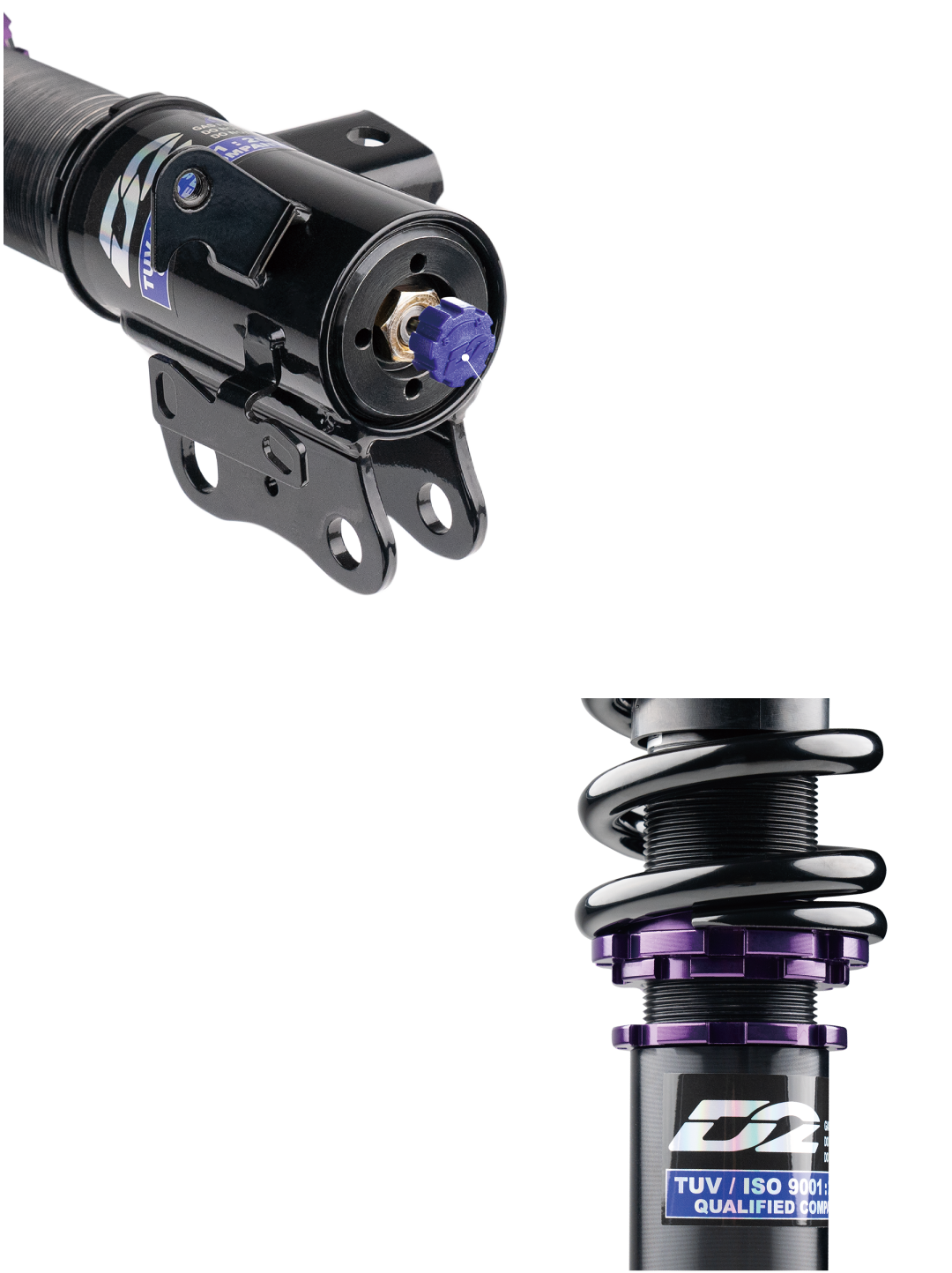 All McPherson suspensions offer mono and inverted tube design (55mm). It can bear the sideway aggressive movement and strong gravity when drifting